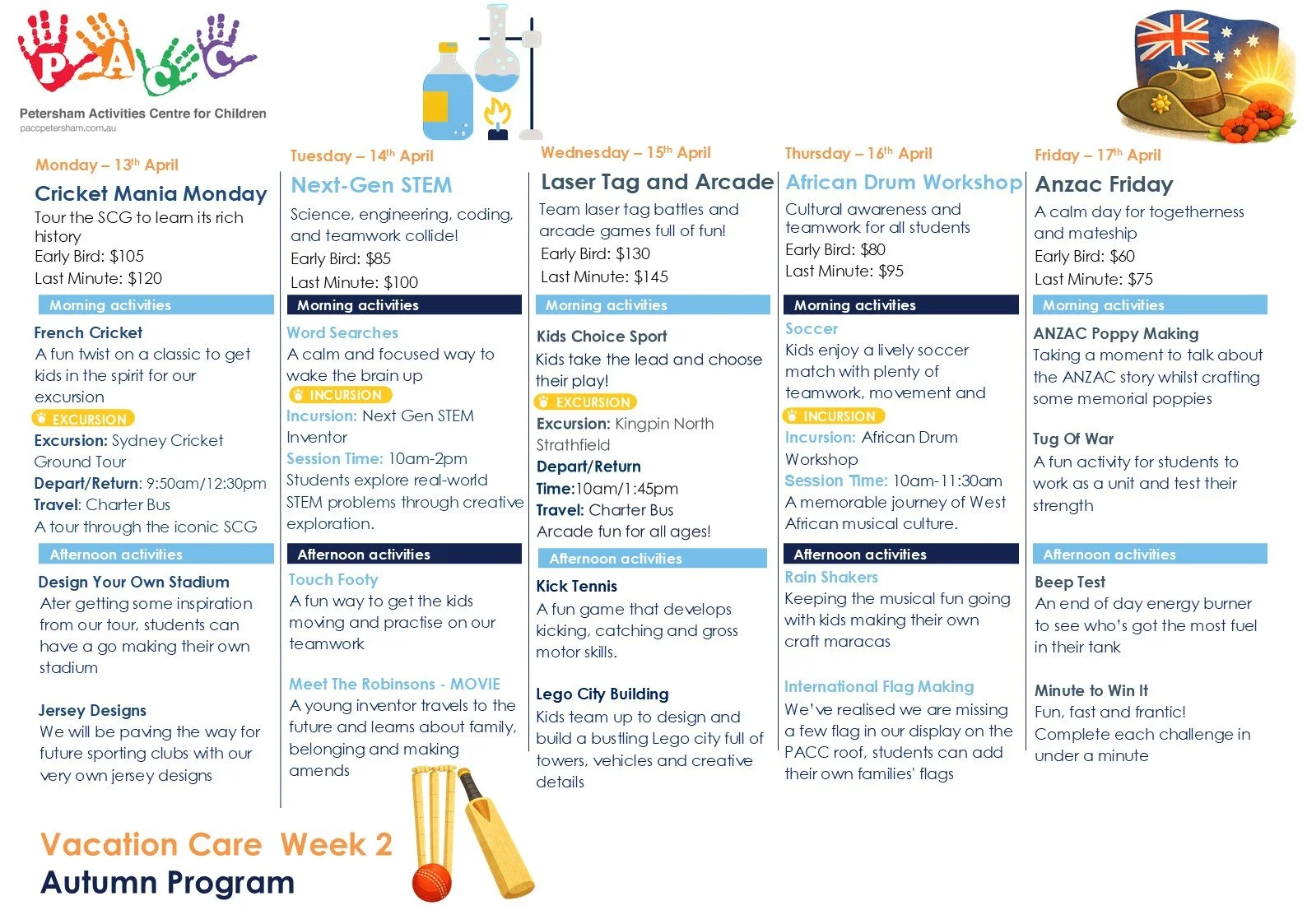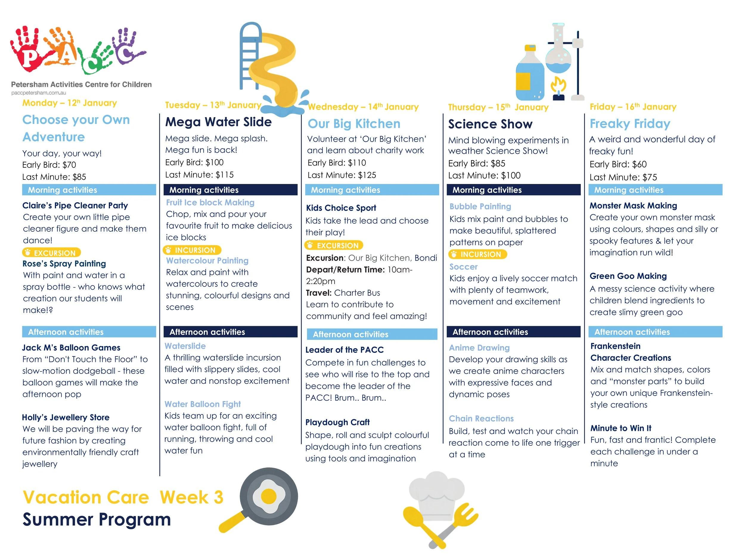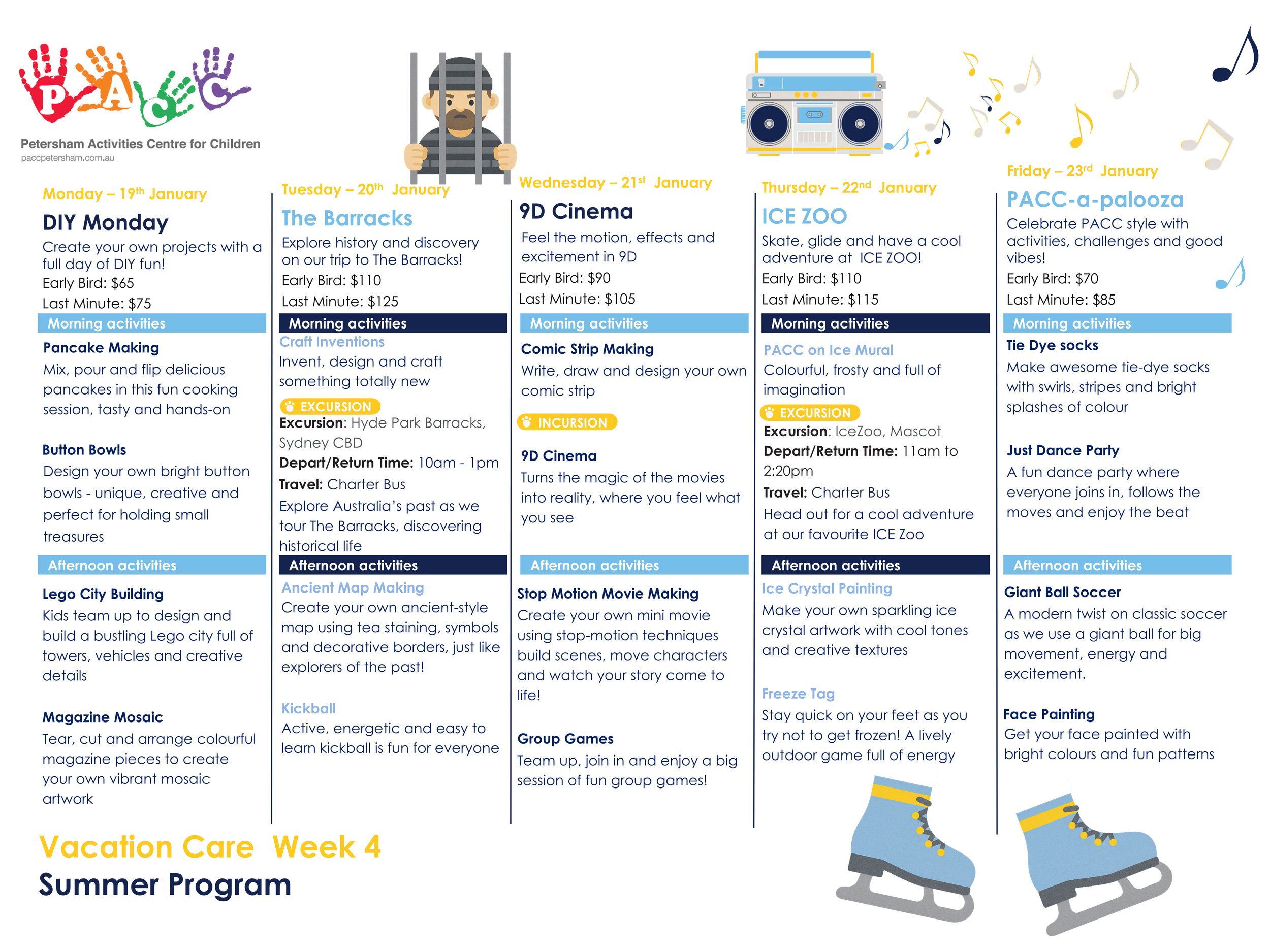 WE OFFER A WIDE VARIETY OF FUN ACTIVITIES FOR KIDS DURING SCHOOL HOLIDAYS. THESE INCLUDE EXCURSIONS TO THE MOVIES, THEATRE, ADVENTURE PARKS AND ACTIVITY CENTRES. WE ALSO HOLD INCURSIONS AT PACC DURING SCHOOL HOLIDAYS INCLUDING COOKING, MUSIC, ART, SPORTS, AND SCIENCE WORKSHOPS.